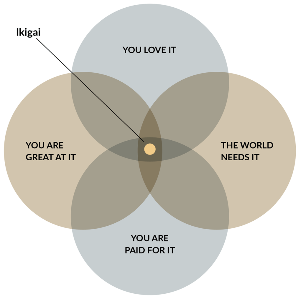 To summarise, your Ikigai is something you are very passionate about, that you are also good at, that the world needs now, and for which someone will pay you.