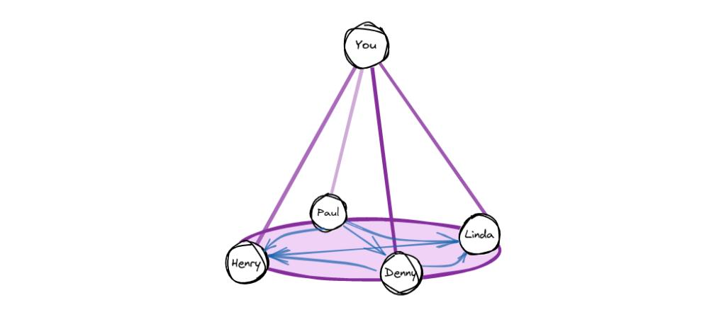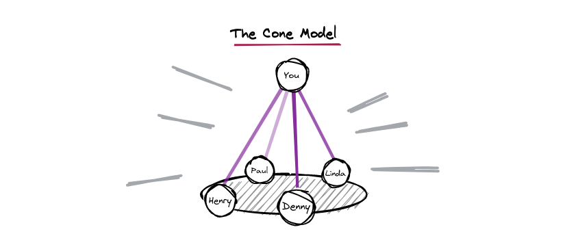 The essence of the Cone Model is to minimize your dependencies while maximising the network between your team members. Instead of letting all your team depend on you for their growth, you should create a connection between people, leveraging the different strengths and weaknesses.