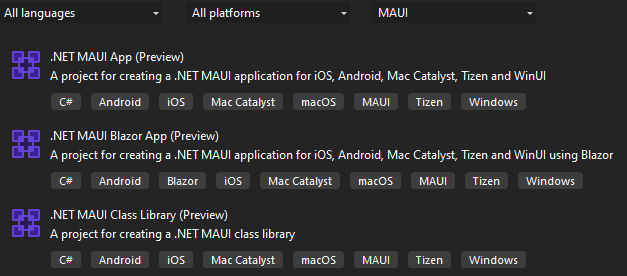 What’s more, .NET MAUI can incorporate web components built with Microsoft’s Blazor framework for creating web apps primarily with C# instead of JavaScript. .NET MAUI features the BlazorWebView control, which permits rendering Razor components into an embedded Web View. By using .NET MAUI and Blazor together (Blazor Hybrid apps with .NET MAUI), developers can reuse one set of web UI components across mobile, desktop and web. As shown in the graphic below, .NET MAUI Blazor App is now a Visual Studio 2022 project type.