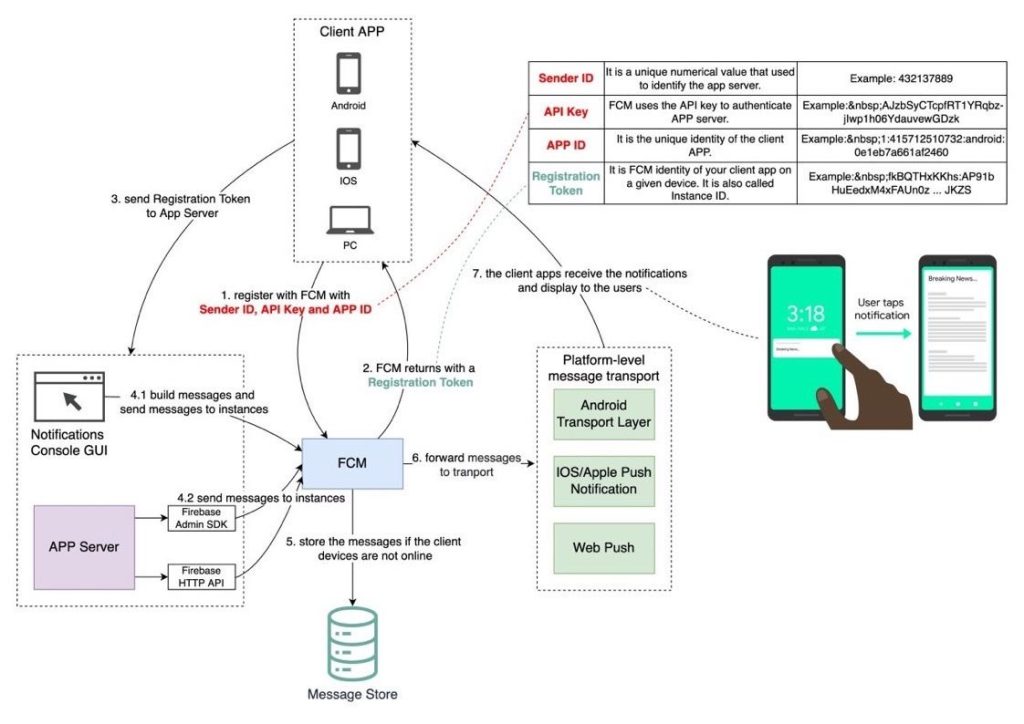 - An Apple, Android, or web (JavaScript) client app that receives messages via the corresponding platform-specific transport service.