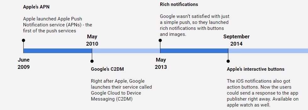 In 2009, Apple launched the first-ever push notification service – Apple Push Notification Service (APNs). Google didn’t stay behind for too long and launched its Cloud to Device Messaging service (C2DM) in 2010.