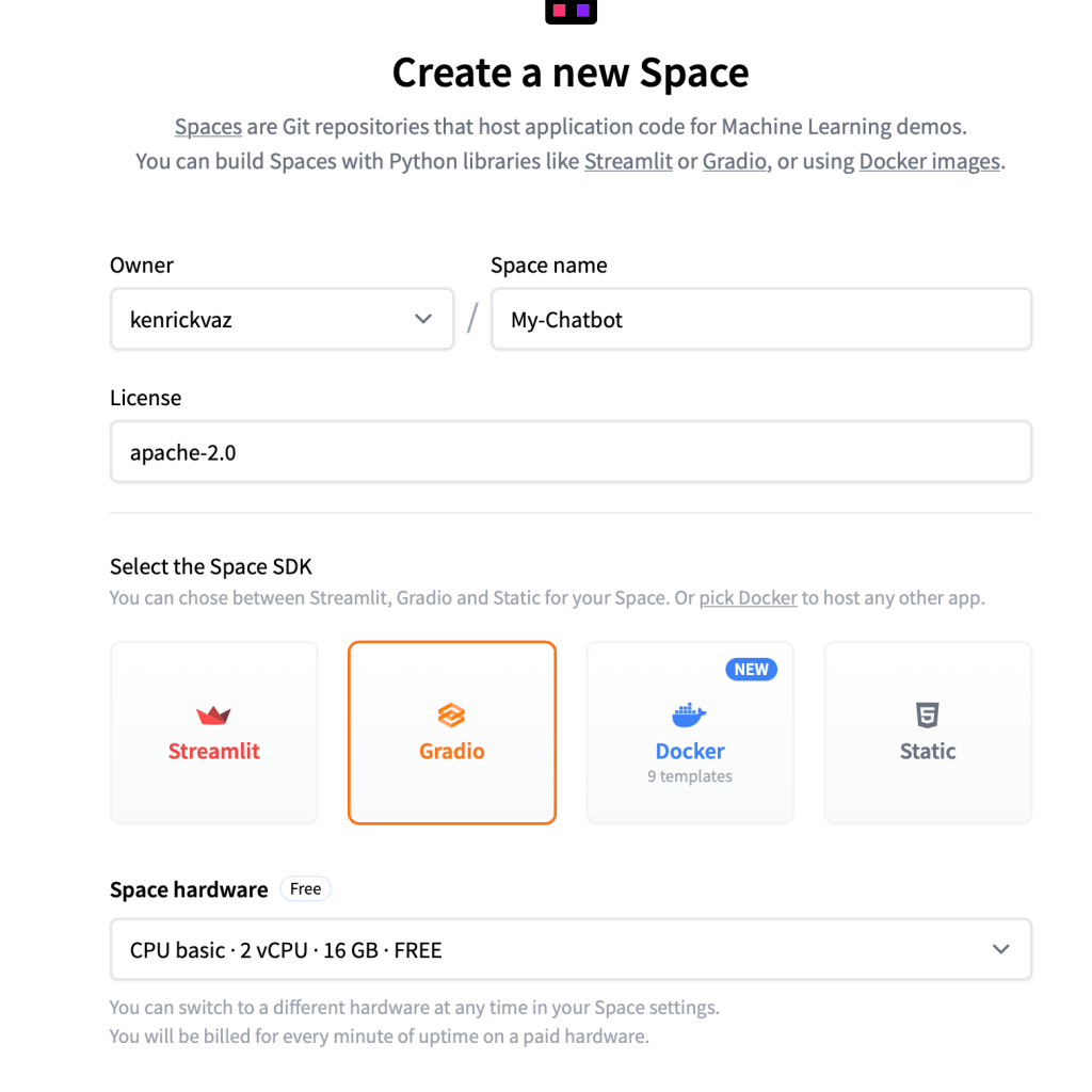 Fill out the form with App name, Licence, Space hardware, and visibility.
