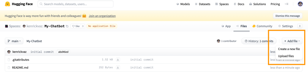 Next, on the space you just created, click on the “Files” tab > + Add file > Create a new file.