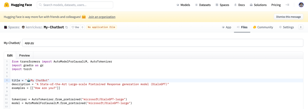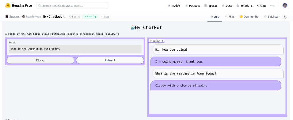 I started out with building a simple chatbot using the Microsoft DialoGPT model, Hugging Face Space, and Gradio interference. I am sure you will be able to develop and customize your own one using a similar technique. So let’s get started!