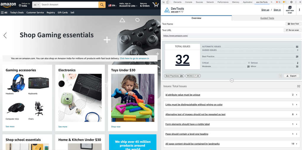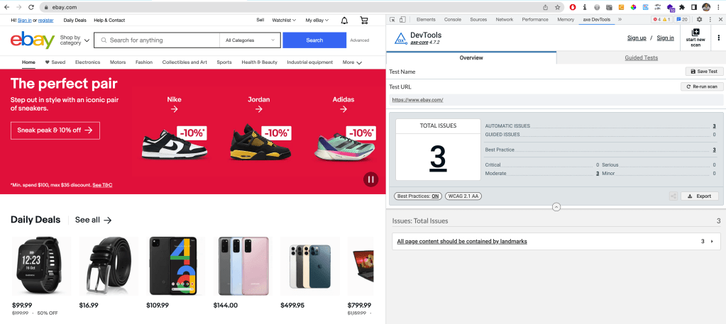 I did a quick check for eBay.com renowned for its high standards when it comes to engineering. Below we see just 3 issues shown on the axe DevTools Chrome extension for eBay as compared to amazon.com