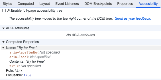 Here, you will find additional information about the ARIA labels, name, role, and computed properties.