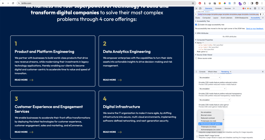 DevTools has a feature to emulate vision deficiencies such as blurred vision, reduced contrast, or red-green color blindness to the page you are currently visiting. To enable this, in your DevTools, press Cmd + Shift + P in the console ( or Ctrl + Shift + P on Windows) to open up the Command Menu. Select or type ‘Show Rendering’. All the way at the bottom, you will find the option to emulate vision deficiencies.