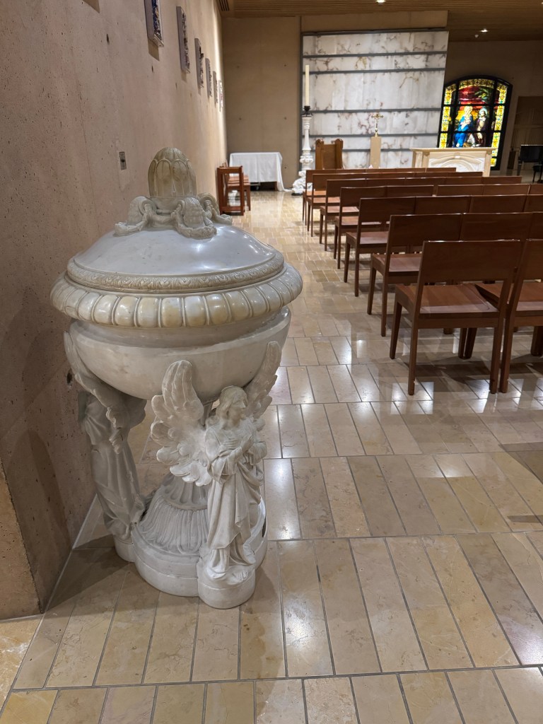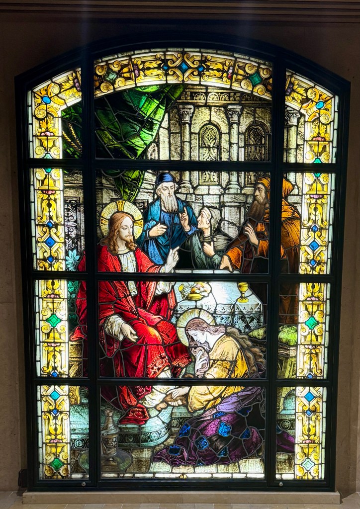 Inside, soft light filtered through alabaster windows, casting a warm glow on the vast sanctuary. The tapestries lining the walls, each depicting saints from across cultures and history, added a rich spiritual texture. Our daughter was fascinated by the space—quietly pointing to the ceiling, then to the massive organ pipes above.