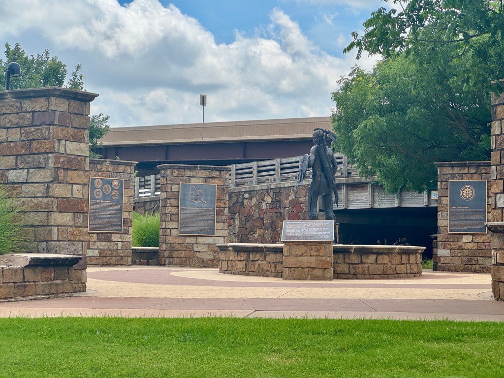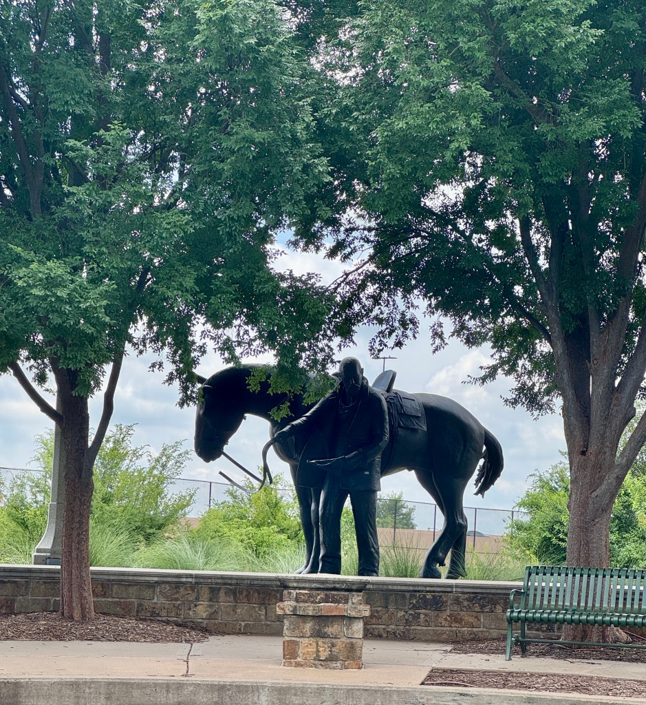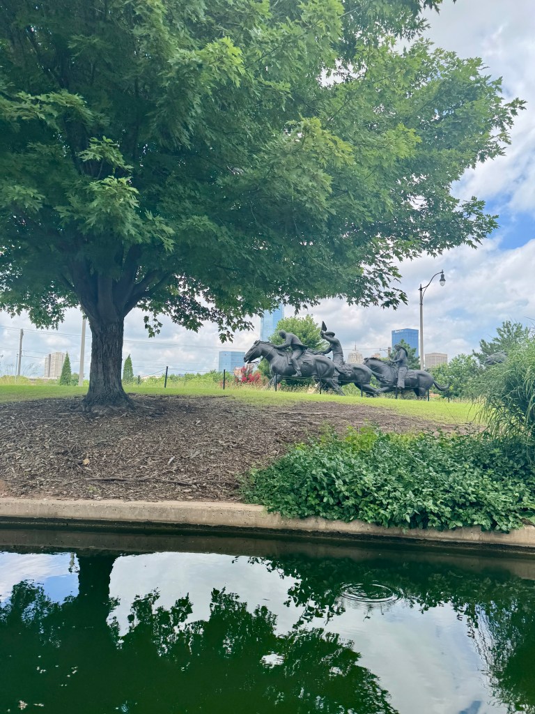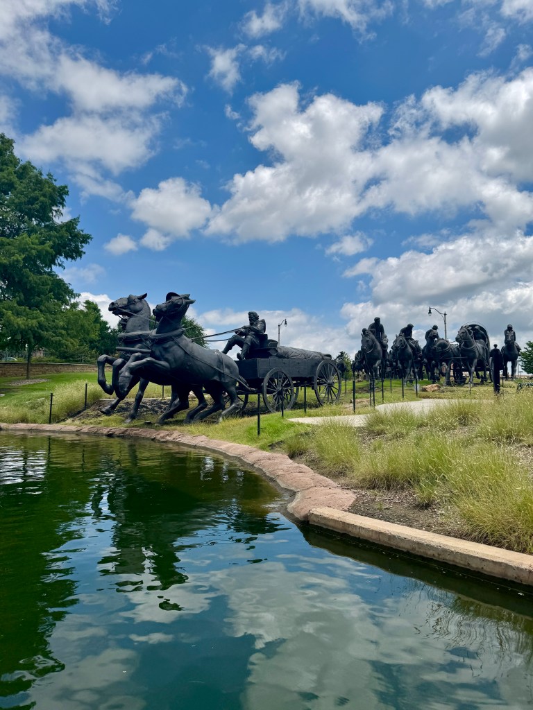 Near the canal, we came across one of the most awe-inspiring art installations in the state—the Centennial Land Run Monument. Spread across over 365 feet, this bronze sculpture series captures the chaotic energy of the 1889 Land Run, with settlers, wagons, and horses frozen mid-motion.