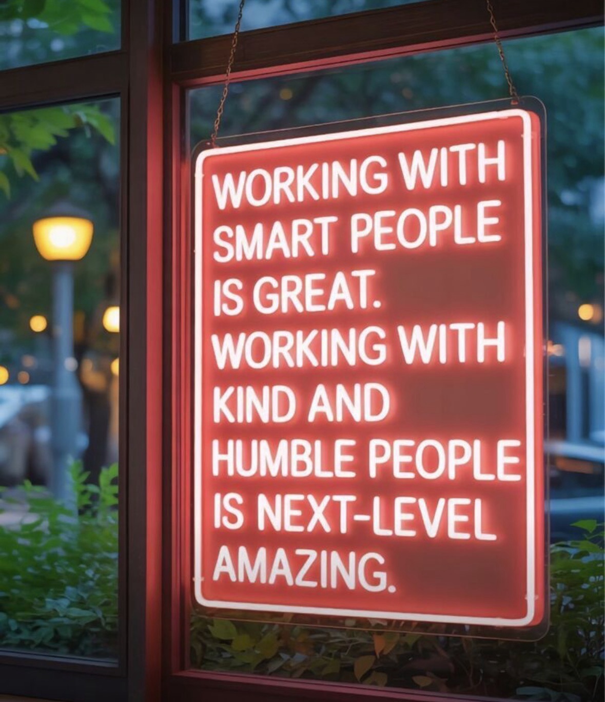 Because smart people can solve problems. But kind and humble people? They make you want to solve them together. They create an environment where you’re not afraid to ask questions, admit mistakes, or say, “I don’t know.” There’s no ego, no one-upmanship—just genuine curiosity and respect. You grow because you feel safe enough to stretch yourself. You thrive because you know you’re supported, not judged.
