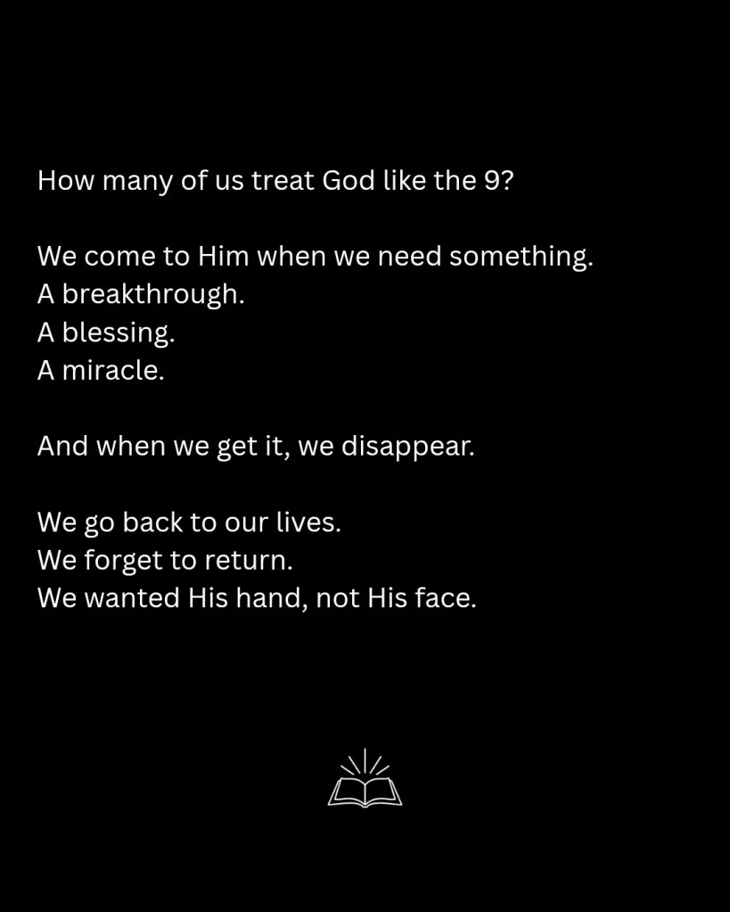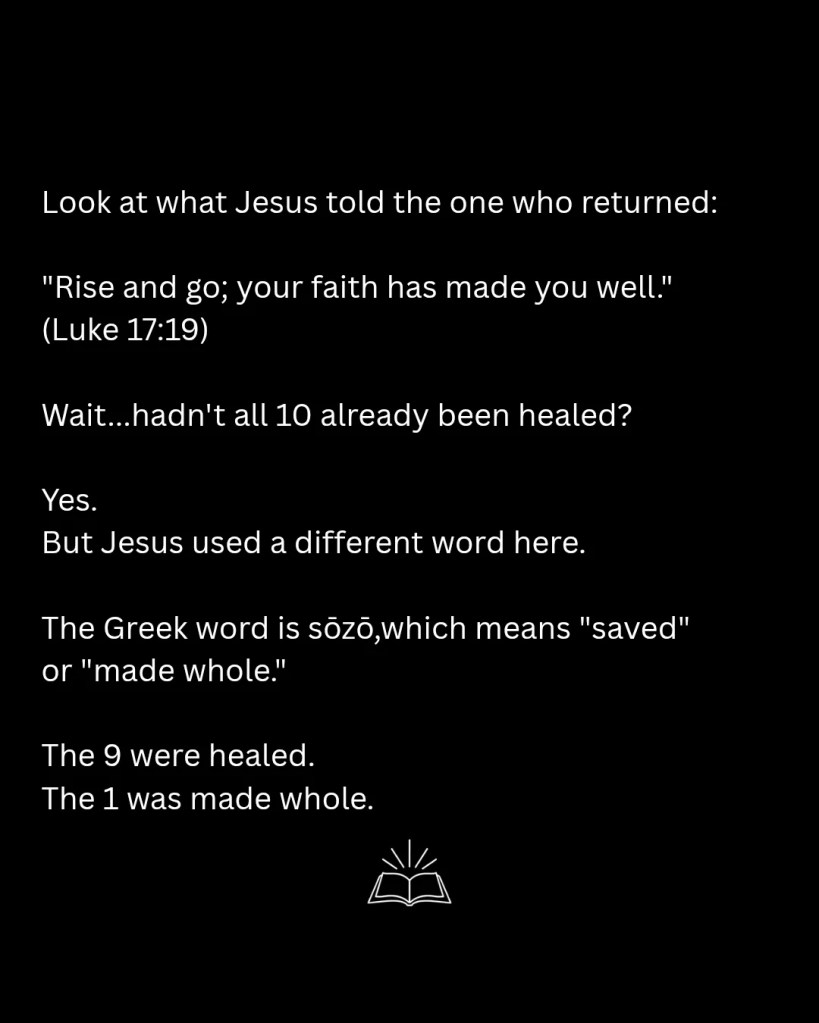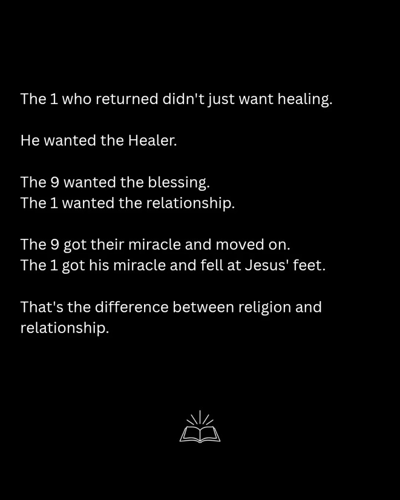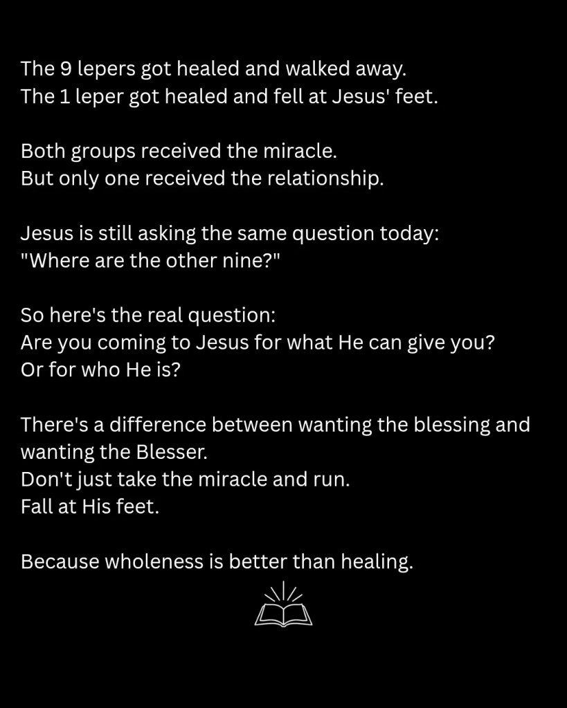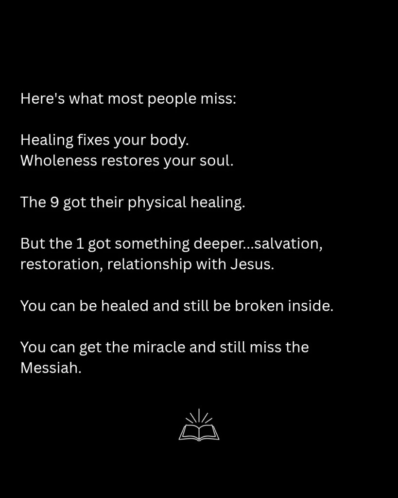 Healing fixes what is broken on the outside. Gratitude reorders what is broken within. In returning, the one who came back discovered something deeper than restored skin or renewed strength: a restored relationship. The miracle was a gift, but coming back to His feet was the moment wholeness truly began.