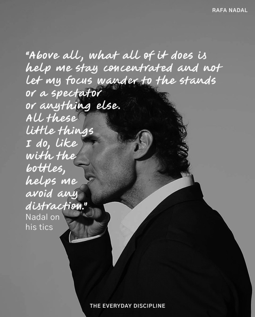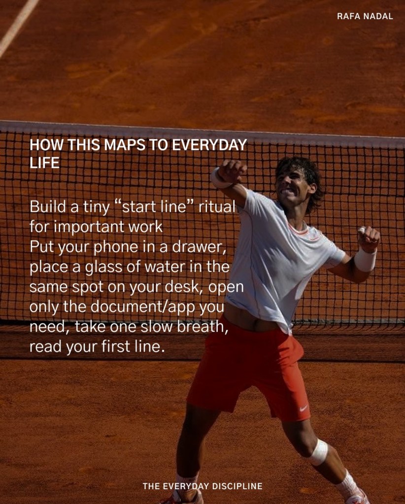 What I love most about Nadal’s insight is the idea of “ordering the outside to match the order I seek inside.” That flips the usual narrative. We often wait to feel calm before we act. He acts in a calm way so calm can arrive. The ritual comes first. The mindset follows.