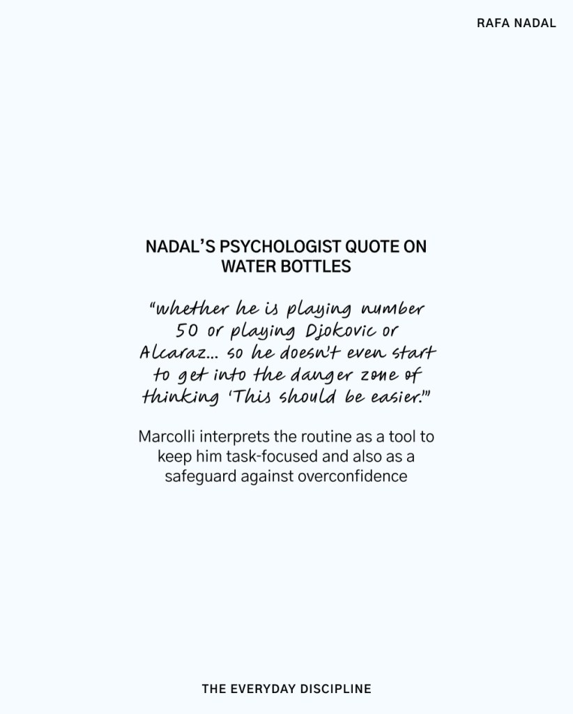 What struck me about that explanation isn’t the bottles. It’s the honesty behind it. If it were superstition, he says, he’d only do it when he’s winning. But he does it whether he’s ahead or behind, confident or struggling. Because the act isn’t about controlling the outcome. It’s about controlling the inner space he steps into before the point begins.