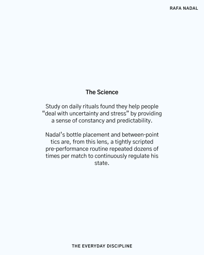 We often confuse rituals with magical thinking. We assume they’re about luck, fear, or trying to bend fate in our favor. But the best rituals aren’t about the future. They’re about the present. They’re about alignment. Nadal isn’t trying to convince the universe to let him win a point. He’s bringing his surroundings into harmony with the clarity he wants in his mind.