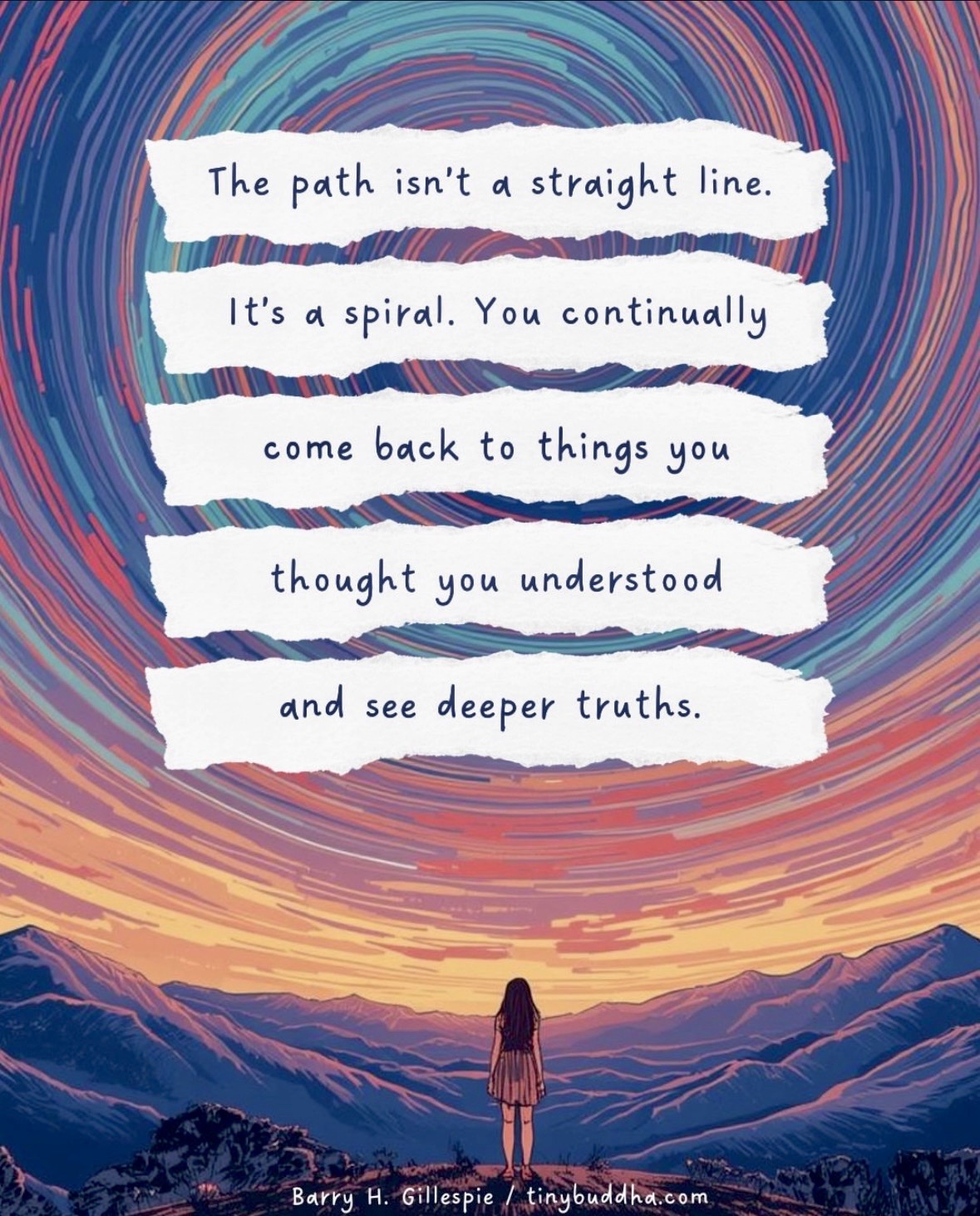 But the spiral has a quiet wisdom to it. Each time you return, you’re not standing in the exact same place. You’re seeing the same truth from a different height, a different angle, a different version of yourself.