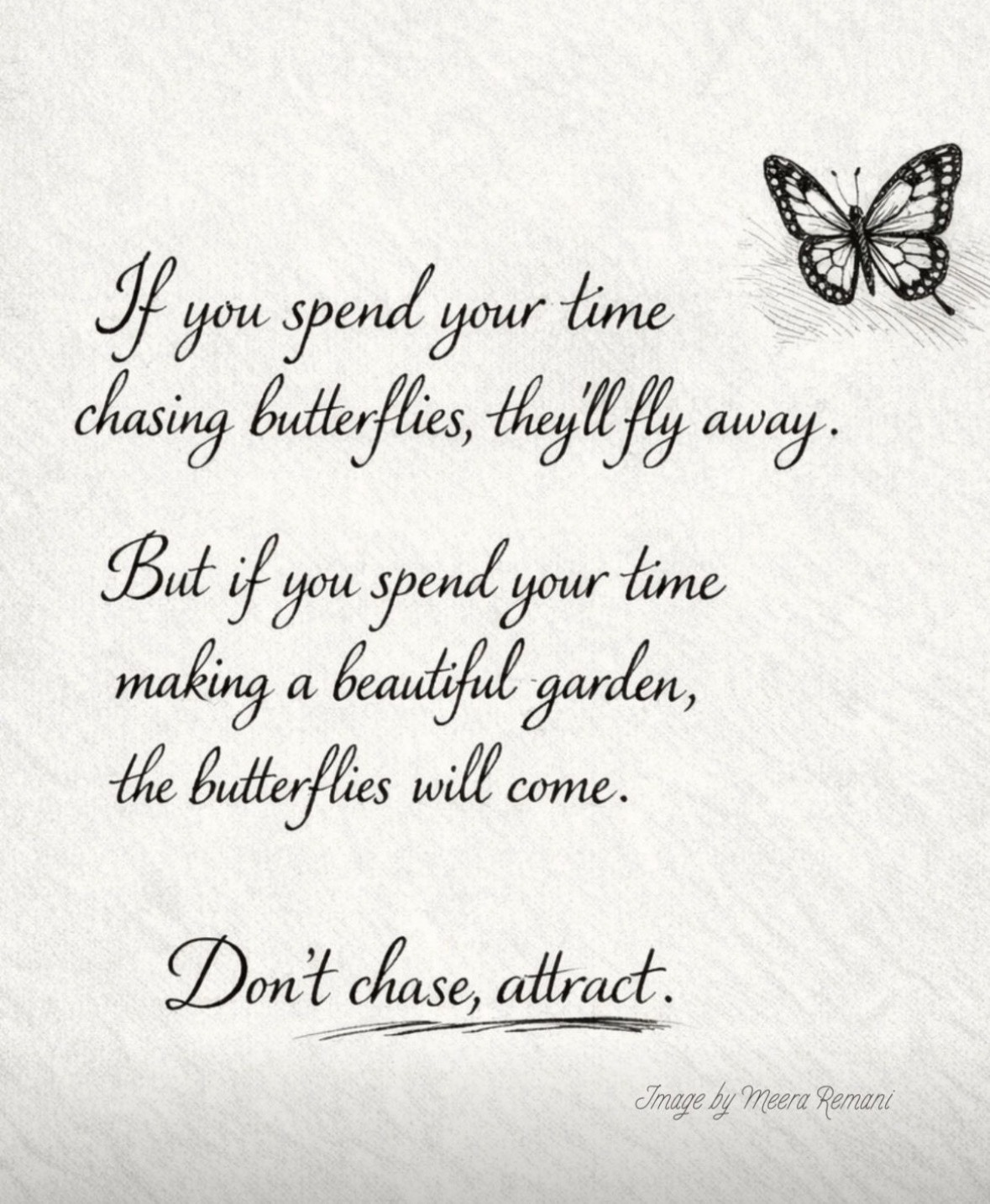 Think about butterflies for a second. You can sprint through a field, arms flailing, trying to catch one—and you’ll only scare them off. But plant a garden? Water it. Take care of it. Let it grow into something alive and beautiful?