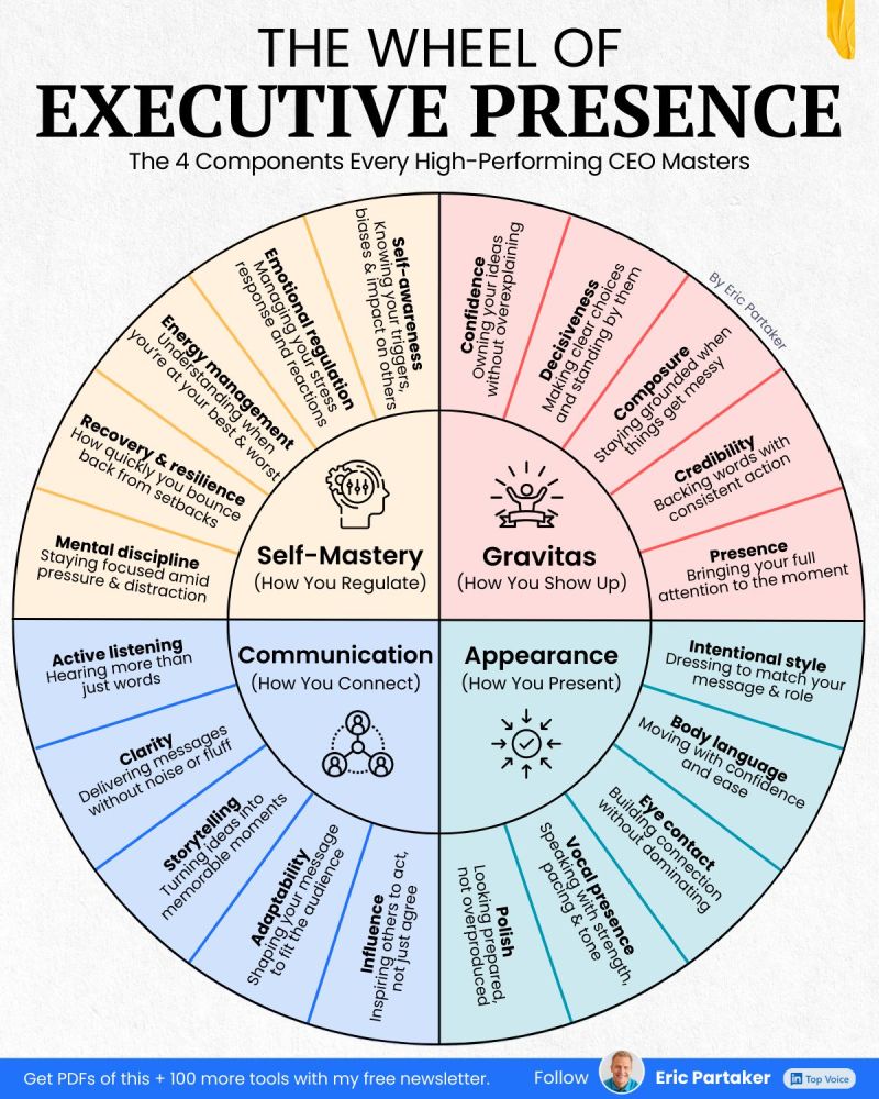 Yes, communication is important. But you have to listen to lead. Not just give orders. Equally important? How you show up (Gravitas)How you present (Appearance)How you regulate (Self-Mastery) Executive presence is how you lead under pressure.Show up in key moments.Earn trust without needing to say much at all. And the best CEOs?They’re working on itContinue reading “The Wheel of Executive Presence”