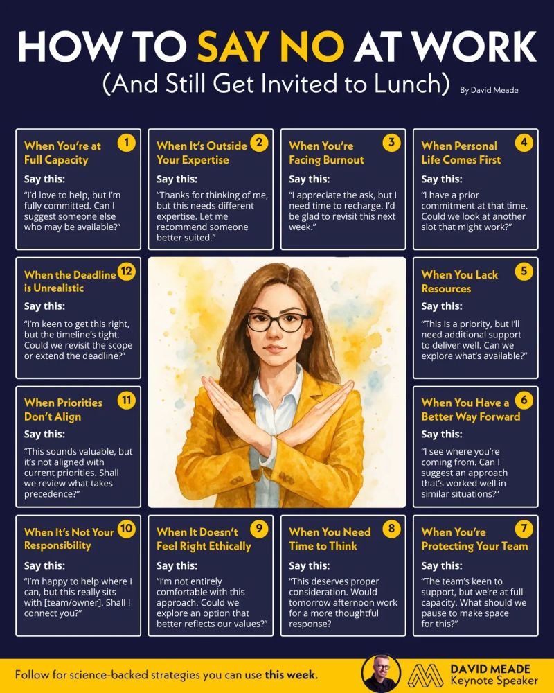 Saying yes to everything is a fast track to burnout. Saying no (the right way) is how high performers stay: — Respected— Focused— In control Here are 12 ways to say no(while still being sort of lovely): 1. When You’re at Full Capacity “I’d love to help, but I’m fully committed. Can I suggest someoneContinue reading “How to Say No”