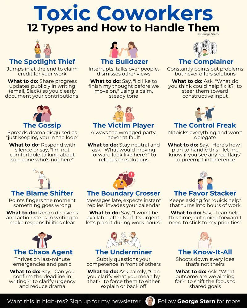 We all know these 12 toxic coworkers. Handle them like a pro: Colleagues like this destroy morale and slow down teams. They:↳Interrupt↳Hog credit↳Spread Drama↳And make every day harder than it has to be. You can’t always avoid them. But you CAN learn to deal with them – Calmly and confidently: 1. The Spotlight Thief↳Jumps inContinue reading “Handling Toxic Co-Workers”