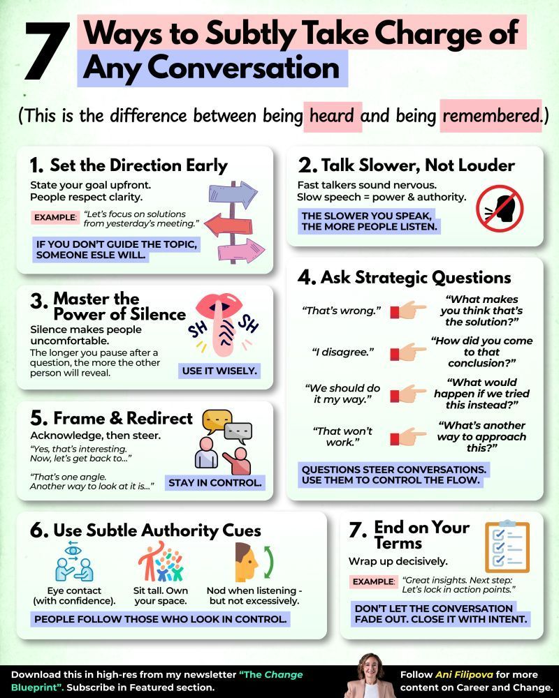 Real leaders do not overpower conversations.They orchestrate them. They set the tone,guide the flow,and leave people feeling bigger, not smaller. I learned this the hard way.After years of trying to dominate discussions,I realised the best leaders don’t need to speak a lot.They simply know exactly when to. These 7 conversation cues are your toolkit forContinue reading “7 Ways to Subtly Take Charge of Any Conversation”