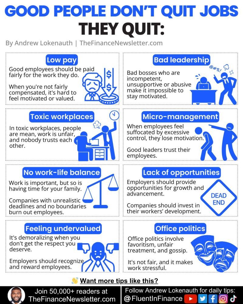 Good people don’t quit jobs. They quit: 1. Low Pay: People work to make money. When you’re not fairly compensated for your work, it’s hard to feel motivated or valued. Top performers know their value in the market. Good employees should be paid fairly for the work they do. 2. Bad Leadership: Bad leaders don’tContinue reading “Good People Don’t Quit”
