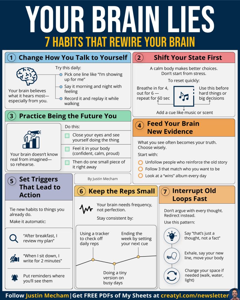 Your brain lies to you every day— And you believe it: But you can retrain it— By feeding it better habits: 🟦 Talk Better to Yourself:Say one helpful line daily.Morning, night, and on walks. 🟥 Shift Before You Act:Calm your body first.Use breathing, music, or scent. 🟩 Practice Being the Future You:See it in yourContinue reading “Rewire Your Brain”